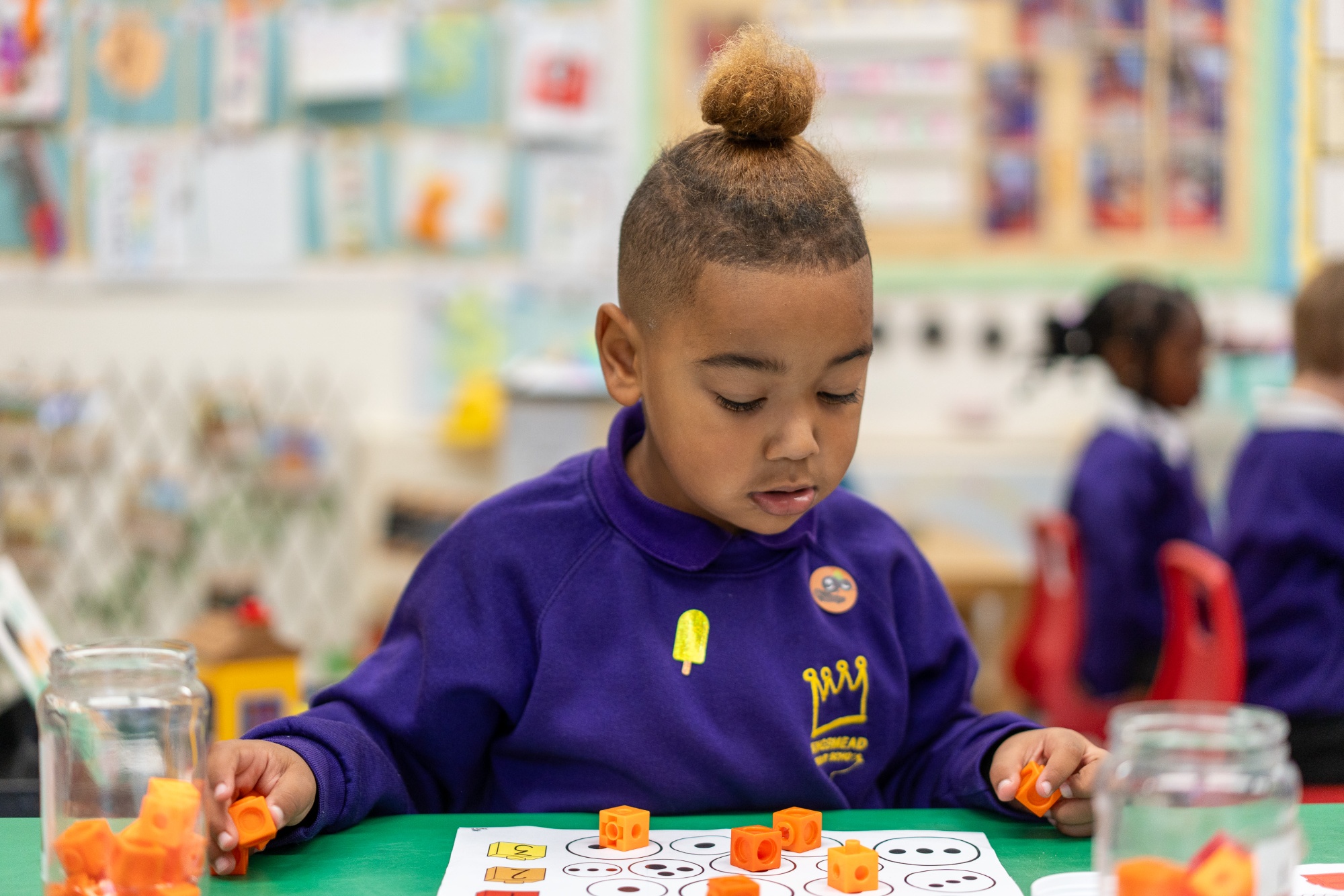 The children in our Nursery and Reception (Foundation Stage) classes follow the Early Years and Foundation Stage Curriculum (EYFS). The focus of mathematical teaching and learning for this age group is very practical to ensure that the children are fully engaged while learning the initial concepts through use of concrete resources as well as role play, dressing up, storytelling etc. Children learn to count forwards and backwards, recognise numbers and understand the one-to-one concept of counting using resources such as objects, unifx cubes and Numicon. They are taught to see numbers within numbers and recognise patterns quickly such as those on dice and dominoes (subsitising). The 'Mastering Number' programme is also followed to ensure that children are fluent in those small number facts that will form the basis of all future maths.