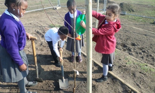 Year 2 and Year 5 have been busy helping to plant lots of fruit trees and shrubs on Mabley Green, as part of the Mabley Green User Group's plans to create an edible forest garden for the local community. Kingsmead's school council also helped make signs for the different trees being planted and were involved with Stephanie, the forest gardener, in designing a section of the garden. Hackney Council sent in big diggers to dig out beds which have been filled with new, clean earth and to create low mounds to protect the young plants and trees. Next term Year 1 will also help with planting and the school will be involved with looking after the new plants.